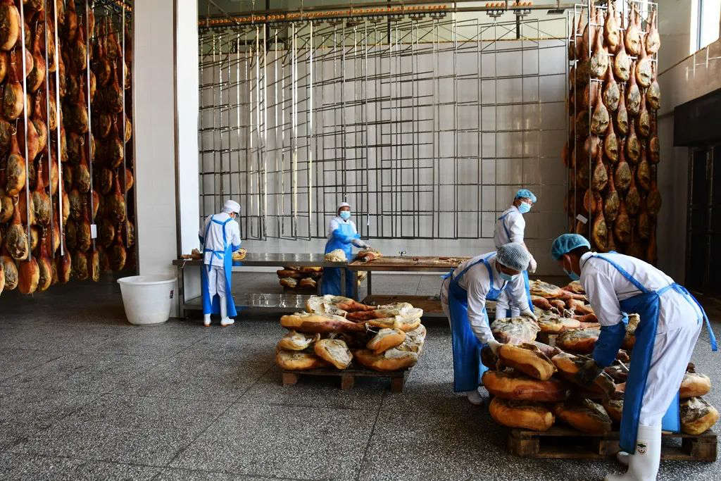 老浦家火腿生产负责人朱发明介绍:“公司每年生产10万条,两千吨火腿,第一季度已经完成了500吨的产能,每天生产6吨多,每年从头年的三月份到次年三月份任务就完成了。”