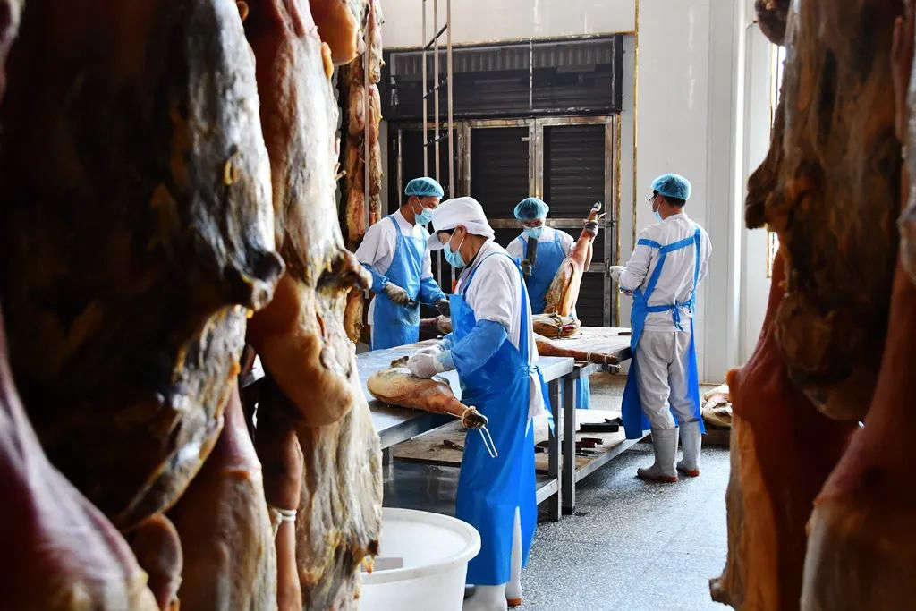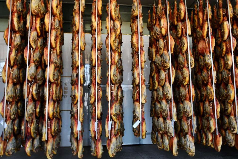在老浦家火腿生产车间,工人们正在为火腿“整形”,清洗、悬挂,一道道工序衔接有序,伴随着忙碌,今年的火腿腌制工作已接近尾声。