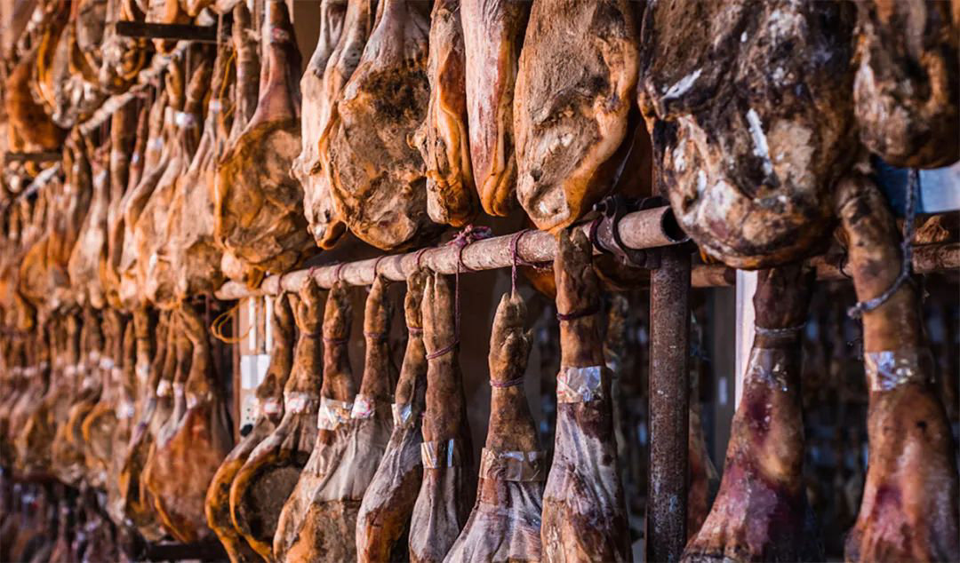 之后堆码翻压,使盐分更好渗入,以及赋予火腿特有的外观。接着洗晒整形,进一步修割整形,获得更好的外形。最后上挂风干,发酵成熟,时间跨度从半年到一年不等。